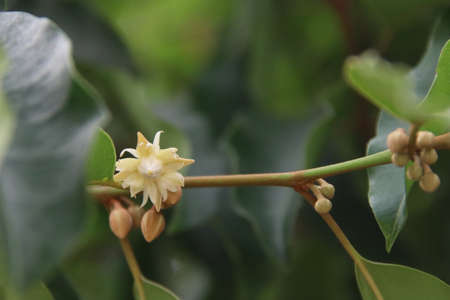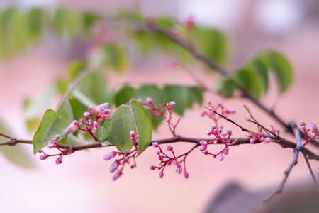 Bullet Wood's flower blooming on brandh with buds on segment of branch and blur green leaves background, Thailand.