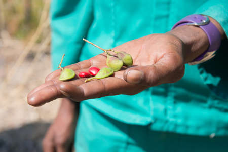 Red and green coffee seeds on a human hand. Namibia. Africa