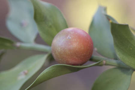 Ruscus aculeatus butcher's broom, knee holly or piaranthus small sharp-leaved shrub with deep red berries and tiny flowers on natural background flash lighting