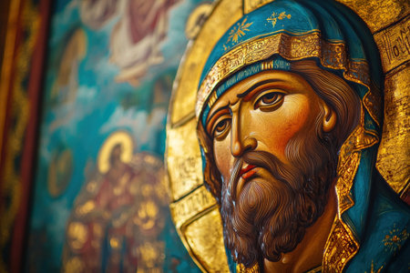 Ornate and richly detailed traditional Eastern Orthodox Christian icon painting depicting a religious figure The icon features traditional Byzantine style elements and religious symbolism