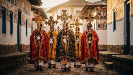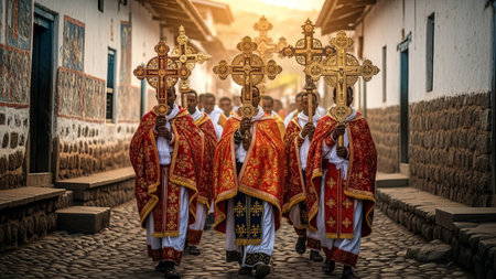 Ethiopian priests process with golden crosses, wearing ornate robes.