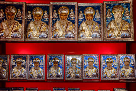 Demre, Turkey - May 21, 2019: Orthodox icons on the shop counter