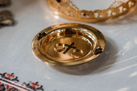 Wedding rings on a golden plate