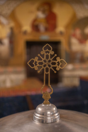 Orthodox church interior with a cross on top of a bell.