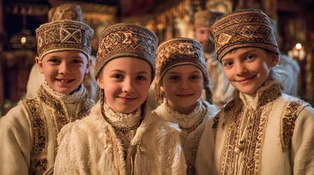 Children in traditional Russian clothes at the celebration of Maslenitsa.