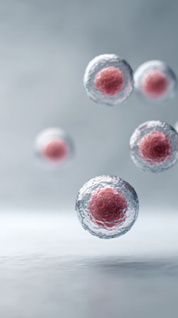 Biological cells float in blue fluid with clear membranes surrounding textured red nuclei. Soft reflections and shallow depth create a scientific mood and blurred background provides negative space for text or overlays