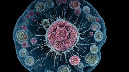 A captivating close-up view of biological cells showcasing intricate structures and vibrant colors in a scientific context, perfect for educational purposes.