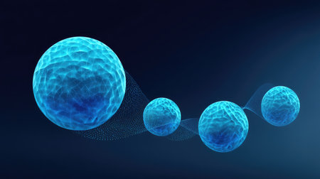 Explore an abstract digital art piece showcasing blue bacteria-like spheres symbolizing growth and evolution, set against a dark gradient background for a striking visual effect.