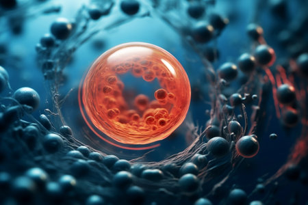 An intriguing close-up view of microscopic cells floating in a dark background, illustrating the complexity of biological structures and cellular environments.