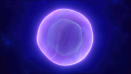 Biological cell rendering, depicting detailed cellular structure with a visible nucleus and outer membrane, floating with other eukaryotic organelles in a scientific setting