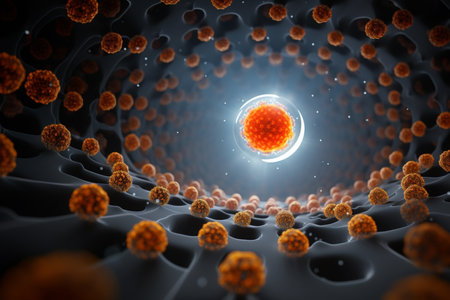 Orange central cell in sharp focus with textured membrane and soft background blur, dramatic lighting emphasizes surface anatomy and biochemical context for educational and editorial use