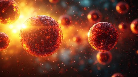 Colorful cells float in glowing space, contrasting with the fiery background.