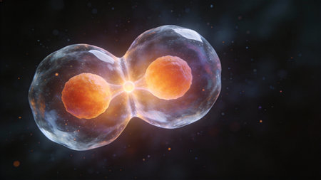 Detailed close-up of a cell undergoing division during mitosis, showcasing vibrant blue and orange hues. Ideal for illustrating cellular biology, genetics, or scientific concepts.