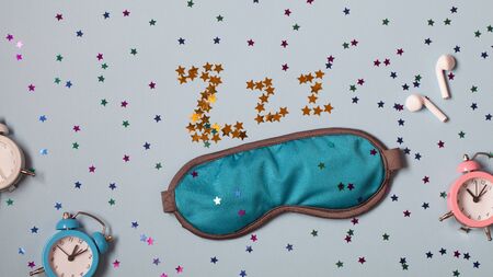 blue sleeping eye mask and alarm clocks on blue background with small stars. Rest, good night, siesta, insomnia, relaxation, tired, travel concept. top view flat lay banner