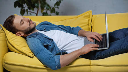 Sleepy freelancer yawns while lying with computer on couch. Guy in eyeglasses and plaid shirt is bored at home during quarantine. Remote work concept. Tinted image.