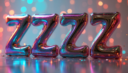 Colorful metallic Z letters create a playful vibe against a dreamy bokeh background. The shiny letters, reflecting vibrant hues, evoke a sense of fun and relaxation, perfect for sleep-themed designs