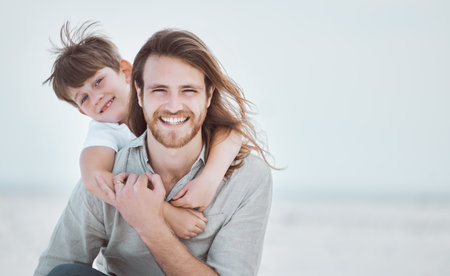 Family holiday and togetherness. Father and son together. Daddy and son smiling and hugging. Carefree. Imagination.