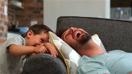 Happy father and son having fun together on a bed