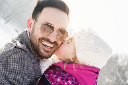Handsome dad and his son are having fun outdoor in winter