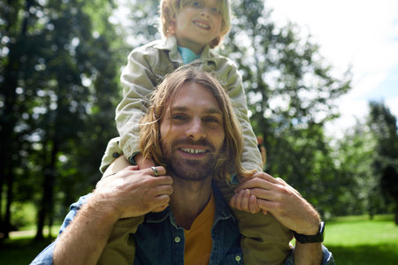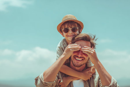 Joyful dad gives son a piggyback ride under a sunny sky while they both share smiles and laughter during a fun outdoor day