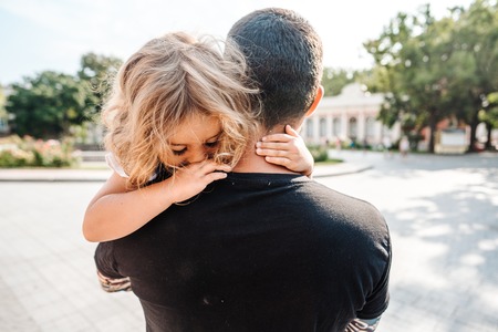 A man warmly hugs a little boy, initiating a close bond, forming a connection that will strengthen over time