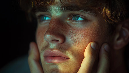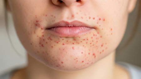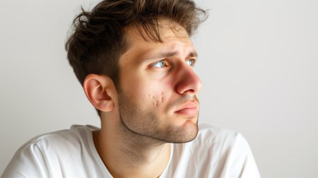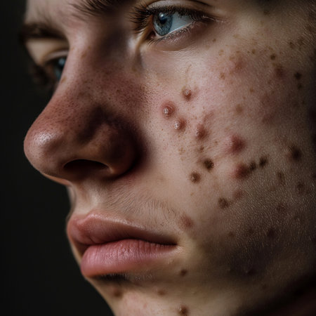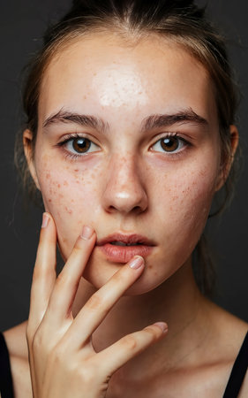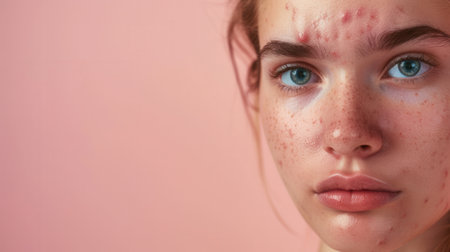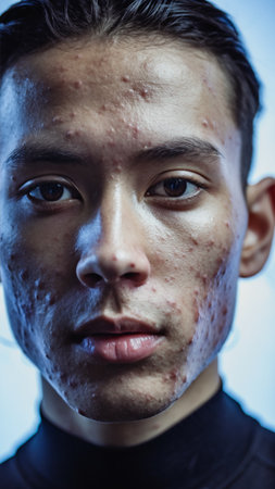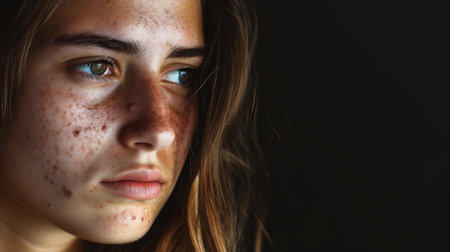 Close-up cinematic portrait of young adult with active acne scarring, perfect for medical, dermatology, skincare campaigns promoting authenticity and real skin conditions
