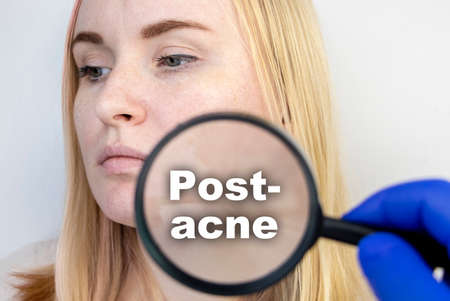Post-acne under a magnifying glass. Skin with acne scars. Woman at the appointment with a dermatologist