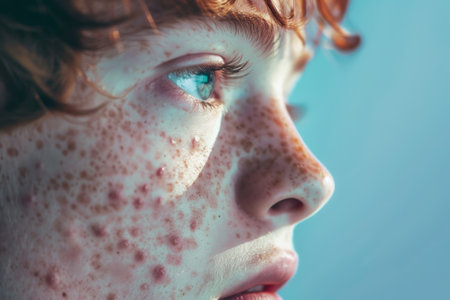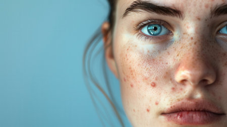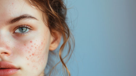 Close up of a young womans face with freckles and acne, depicting skincare concerns or natural beauty concepts