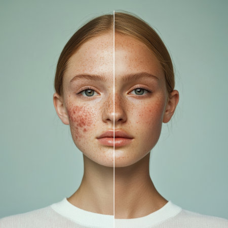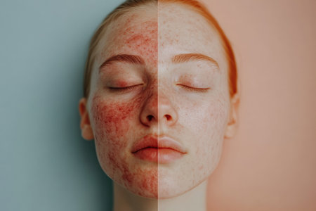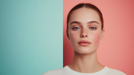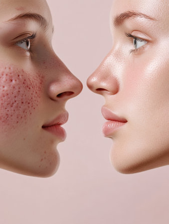 This visual highlights acne and redness on one side, contrasting with smooth, glowing skin on the other side, ideal for skincare exploration.