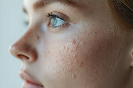 Close up of a young woman with problem skin, showing visible acne and imperfections. Highlights the challenges of dealing with skin issues.