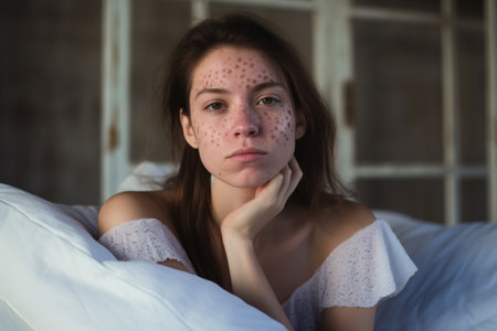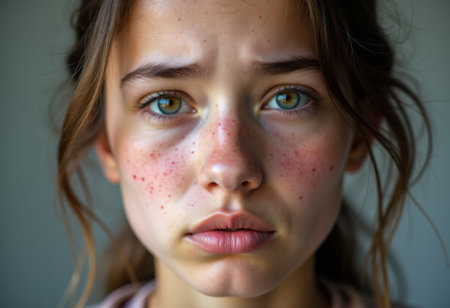 A woman with red spots on her face and neck, AI