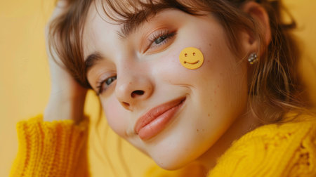 Cute beautiful smiling model young woman with 3D smiley emoji on her cheek, close-up.
