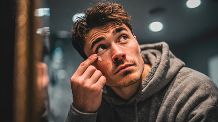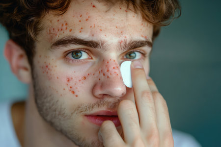 Man treats facial blemish with acne patch, promoting skincare, self-care, and healthy hygiene habits.