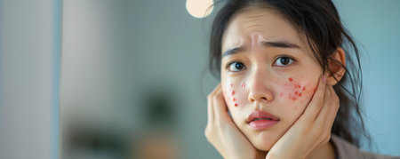 Anxious Asian Woman Seeks Skin Treatment for Red Rash on Face. Concept Skin Care Routine, Facial Products, Red Rash Treatment, Asian Skin Concerns