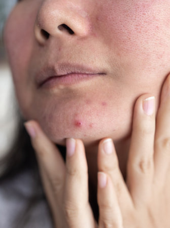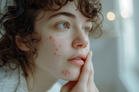 Young person experiencing skin concerns with visible blemishes and redness in an indoor setting during daylight hours. Generative AI
