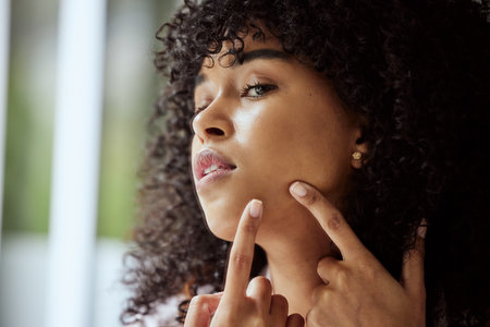 Black woman, hands and facial acne skincare cleaning for beauty hygiene, grooming wellness and cosmetics dermatology in bathroom. Young African girl, checking face pimples and self care cosmetology