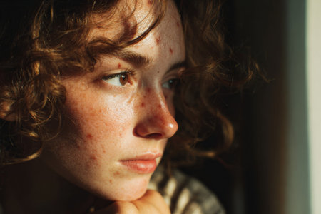 Close-up of a thoughtful woman with curly hair and freckles, gazing out of a window.