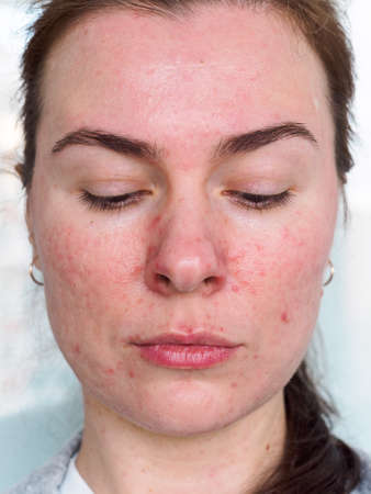 Portrait of a young woman with inflammations on the skin of her face.