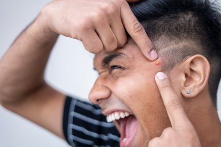 close up of a young man squeezing pimples standing on a white background. acne treatment . man face care.