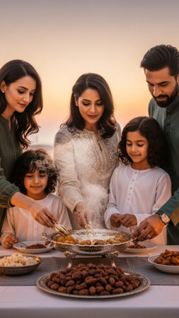 Diverse family setting a beautiful Iftar table before sunset. Focus on steaming food, dates, and warm glowing geometric Ramadan lanterns.