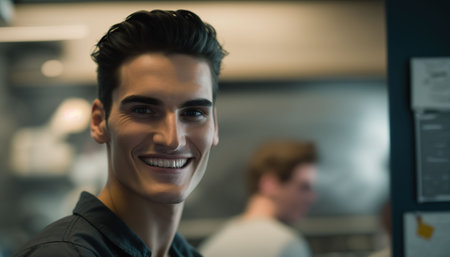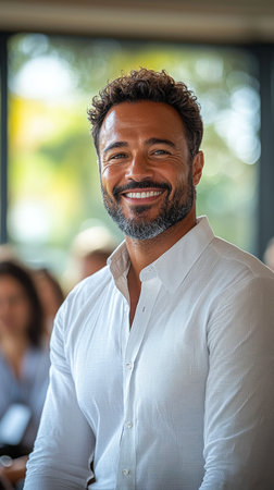A confident businessman with a warm smile presenting at a professional conference. Engaging and inspiring atmosphere with attentive colleagues in the background.