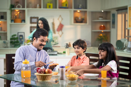 Father with three daughters indoors at home, eating breakfast in kitchen.