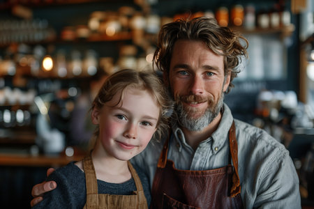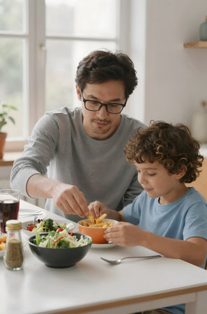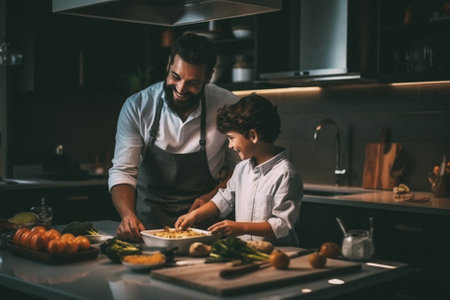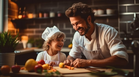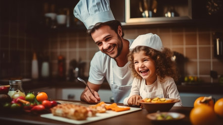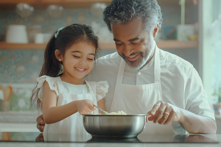 A joyful moment unfolds in a bright kitchen as father teaches his young daughter to cook. They mix ingredients together in a bowl, sharing smiles and laughter during the fun activity.