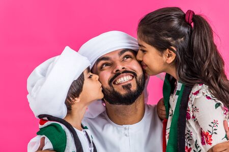 Middle eastern family with traditional emirates dresses posing in a photographic studio - Concepts about lifestyle, happiness and family relationship in the UAE