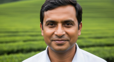 Hispanic male farmer smiling in lush green tea plantation field in daylight