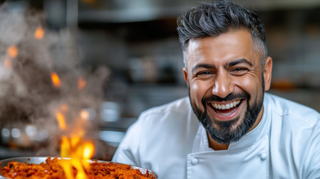 A chef is preparing a dish in the kitchen with smoke rising from the food