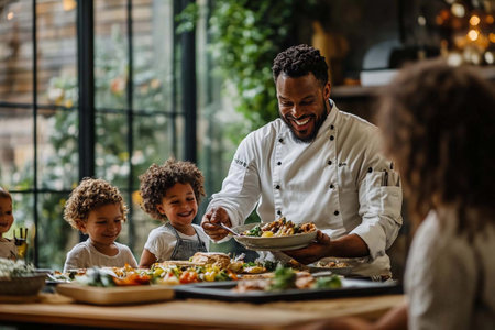 Joyful moments in the kitchen as a chef shares delicious meals with delighted children during a vibrant cooking class. Generative AI