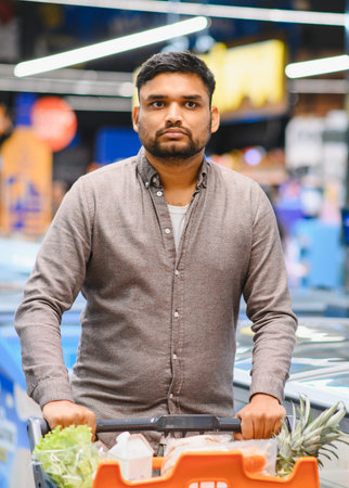 Man pushing a shopping cart filled with groceries, including fresh produce, while moving through a supermarket aisle