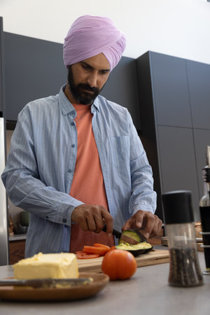 Indian man wearing purple turban slicing avocado, tomato on wooden board at kitchen island. Cooking, culinary, modern, craftsmanship, healthy, lifestyle, preparation