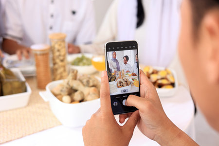 Male Hand Taking Picture of Asian Family and Friend Celebrating Eid Mubarak Festive with Food on the Table